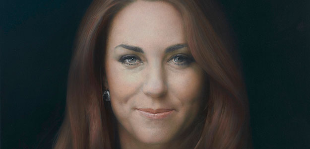 En la pintura, un óleo sobre lienzo de aproximadamente un metro de alto por uno de ancho que se exhibe desde hoy, puede verse el rostro de la esposa del príncipe Guillermo y parte de su vestido azul hasta los hombros, con un fondo negro detrás.