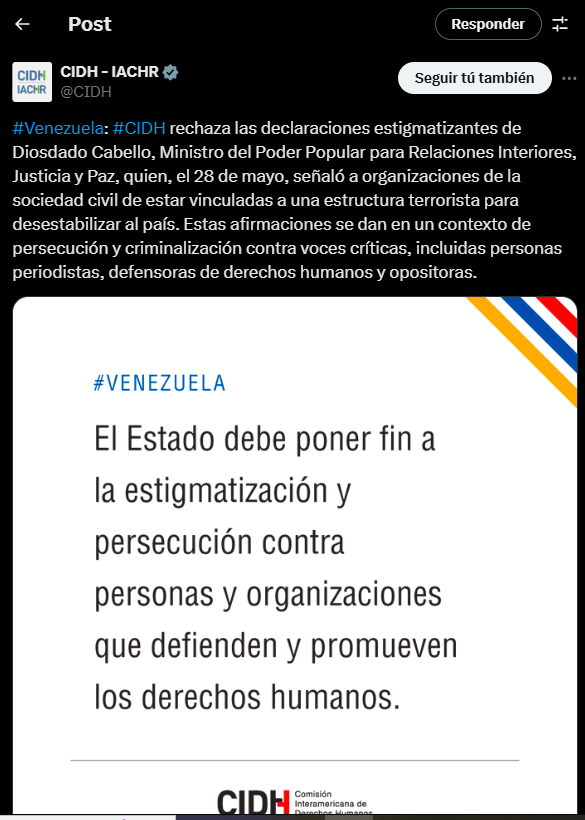 A través de un comunicado publicado en su cuenta oficial en la red social X (antes Twitter), la Cidh calificó dichas afirmaciones como estigmatizantes y alertó sobre su posible uso para justificar actos de persecución y criminalización contra voces críticas dentro del país, incluyendo a periodistas, activistas de derechos humanos y miembros de la oposición política.