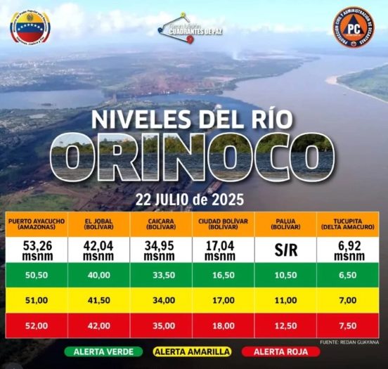 En la región de Caicara del Orinoco, el afluente tiene 34,84 metros, es decir, está a menos de 16 centímetros de la alerta roja, un nivel considerado de extrema emergencia para los organismos de salvamento.