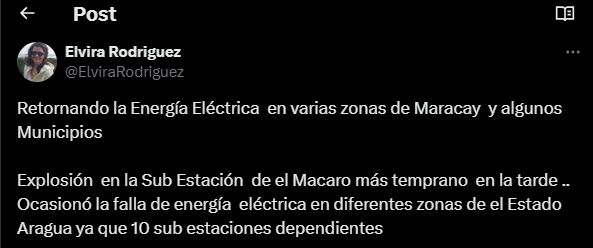 “Retornando la energía eléctrica en varias zonas de Maracay y algunos municipios. Explosión en la Subestación de El Macaro más temprano en la tarde ocasionó la falla de energía eléctrica en diferentes zonas del estado Aragua, ya que 10 subestaciones dependientes quedaron afectadas y, por ende, varios sectores de algunos municipios”, escribió Rodríguez.