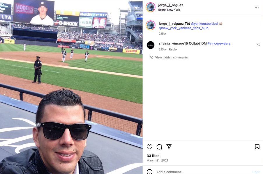 Otra imagen, publicada en redes sociales en 2021 y luego eliminada, lo muestra en un estadio de béisbol en Nueva York.