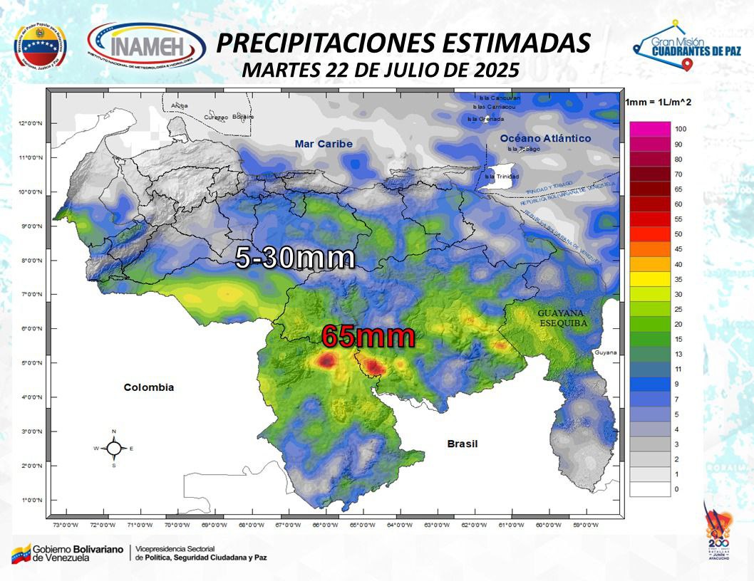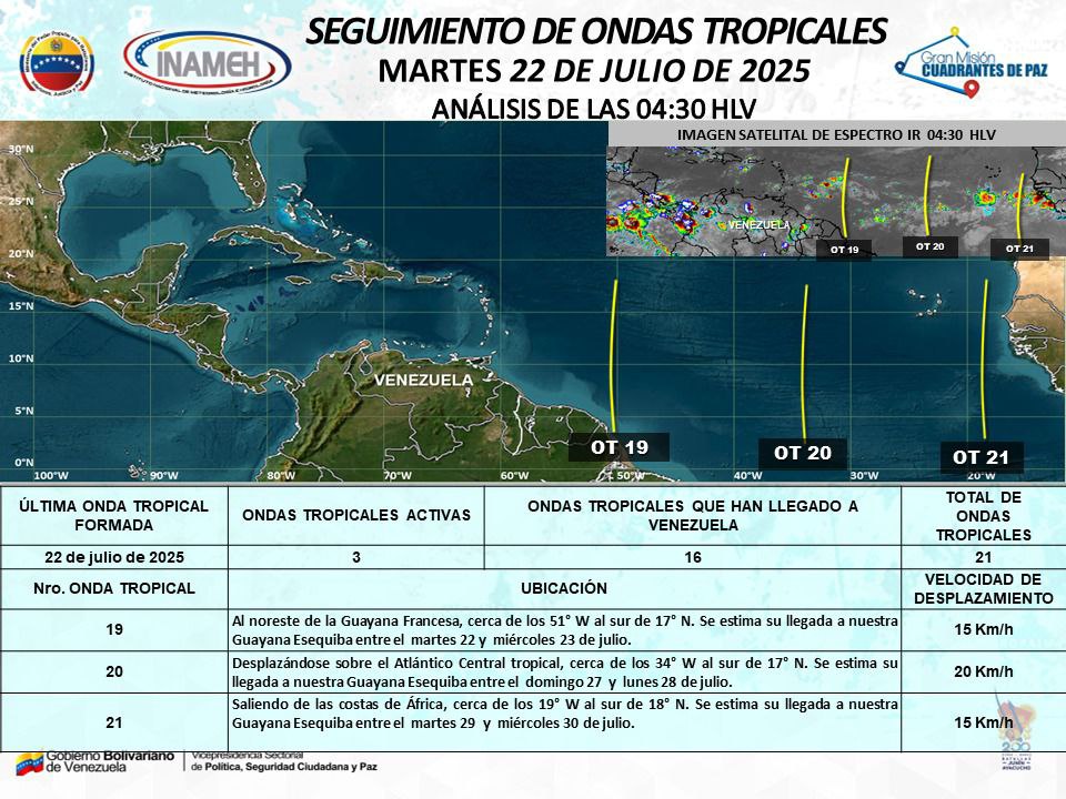 Según el análisis de Inameh, la Onda Tropical 19 se ubica al noroeste de la Guayana Francesa y se estima su llegada a Venezuela entre el martes 22 y el miércoles 23 de julio, con una velocidad de desplazamiento de 15 km/h.