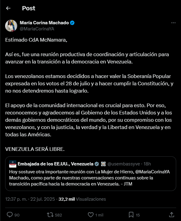 La líder opositora venezolana, María Corina Machado, informó a través de su cuenta oficial en X (antes Twitter) que sostuvo una reunión virtual el lunes 21 de julio con el Encargado de Negocios de Estados Unidos en Venezuela, Brian McNamara, con el objetivo de coordinar esfuerzos para impulsar la transición democrática en el país.