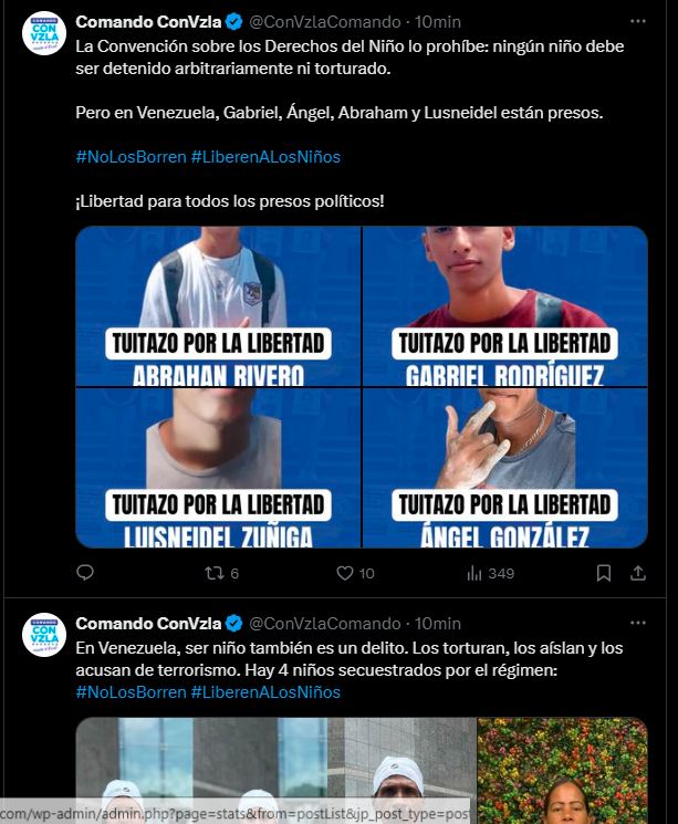A través de su cuenta oficial en la red social X (@ConVzlaComando), la organización denunció que Abraham Rivero, Gabriel Rodríguez, Luisneidel Zúñiga y Ángel González permanecen privados de libertad por motivos políticos, en contravención directa de la Convención sobre los Derechos del Niño, la cual prohíbe expresamente la detención arbitraria y la tortura de menores.