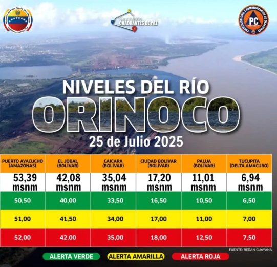 La crecida del río Orinoco por las constantes lluvias en los sectores de El Jobal y Caicara, en el estado Bolívar, sobrepasaron el nivel máximo de alerta roja, según lo confirmó Protección Civil en la región.