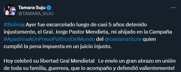«Ayer fue excarcelado luego de casi 5 años detenido injustamente, el Gral. Jorge Pastor Mendieta, quien cumplió la pena impuesta en un juicio injusto», publicó la abogada defensora de derechos humanos, Tamara Suju, a través de su cuenta personal en X.
