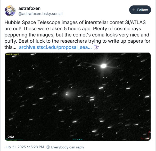 Un astrónomo aficionado, conocido como astrafoxen en Bluesky, editó las imágenes y las subió como dos breves time-lapses, lo que nos da una idea de su vertiginosa velocidad. En relación con el Sol, el 3I/ATLAS alcanzó una velocidad de aproximadamente 220.000 kilómetros por hora cuando fue avistado por primera vez, y su velocidad no para de aumentar. Cabe destacar que las imágenes de cada conjunto se tomaron con apenas minutos de diferencia.