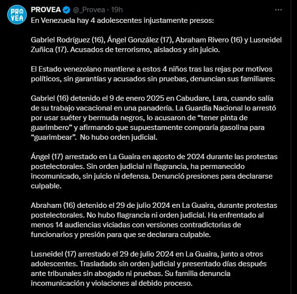 La ONG Provea alzó su voz el jueves 24 de julio a través de su cuenta oficial en la red social X, exigiendo la libertad inmediata de cuatro adolescentes venezolanos detenidos arbitrariamente por el régimen de Nicolás Maduro, quienes han sido acusados sin pruebas y permanecen aislados, sin juicio ni garantías procesales.