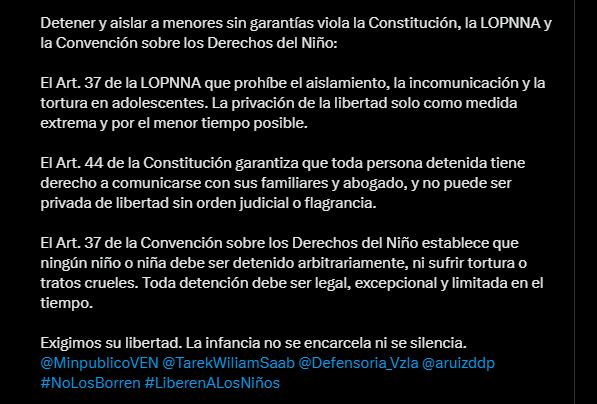 Provea subrayó que estos casos evidencian una sistemática criminalización de la protesta y persecución política incluso contra menores de edad. La ONG recuerda que: El Artículo 37 de la LOPNNA prohíbe expresamente el aislamiento, la incomunicación y la tortura, y establece que la privación de libertad solo debe aplicarse como última medida y por el menor tiempo posible. El Artículo 44 de la Constitución venezolana garantiza que ninguna persona puede ser detenida sin orden judicial o en flagrancia, y tiene derecho a comunicarse con su familia y abogado desde el primer momento de la detención. El Artículo 37 de la Convención sobre los Derechos del Niño, ratificada por Venezuela, prohíbe la detención arbitraria de menores y exige que cualquier medida privativa de libertad sea legal, excepcional y temporal.