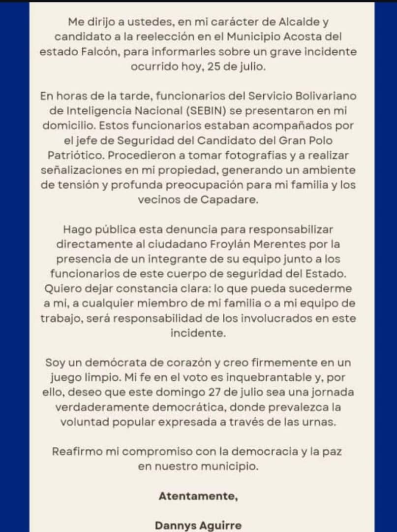 El alcalde del municipio Acosta del estado Falcón y candidato a la reelección por Un Nuevo Tiempo, Dannys Aguirre, denunció públicamente este viernes 25 de julio un nuevo caso de hostigamiento político, tras la presencia de funcionarios del Servicio Bolivariano de Inteligencia Nacional (Sebin) en su residencia en Capadare.