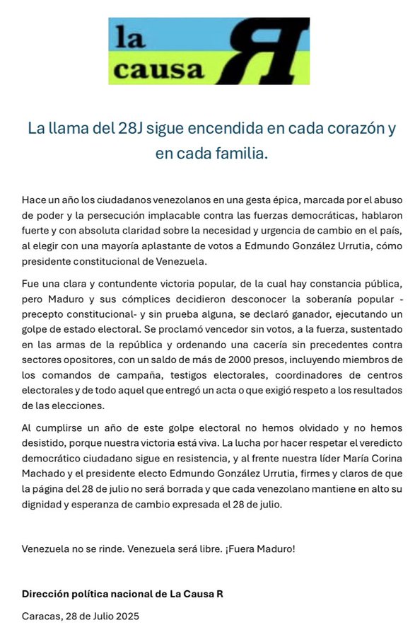 El partido político venezolano La Causa R anunció este lunes que pese a cumplirse un año del golpe electoral, donde se le fue arrebatada la victoria en las elecciones presidenciales a Edmundo González Urrutia, la lucha por hacer respetar el “veredicto ciudadano se mantiene en pie y con la llama encendida”.