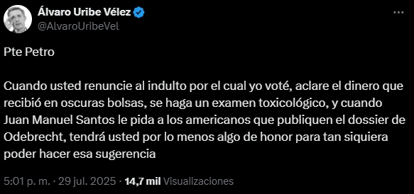 “Pte Petro, cuando usted renuncie al indulto por el cual yo voté, aclare el dinero que recibió en oscuras bolsas, se haga un examen toxicológico, y cuando Juan Manuel Santos le pida a los americanos que publiquen el dossier de Odebrecht, tendrá usted por lo menos algo de honor para tan siquiera poder hacer esa sugerencia”, escribió Uribe.