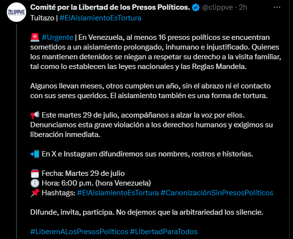 Bajo la etiqueta #ElAislamientoEsTortura, el Comité convocó a un “tuitazo” para hoy a las 6:00 p.m. (hora Venezuela), con el objetivo de visibilizar los casos de los detenidos, sus historias personales y el impacto devastador del aislamiento en su salud física y emocional.