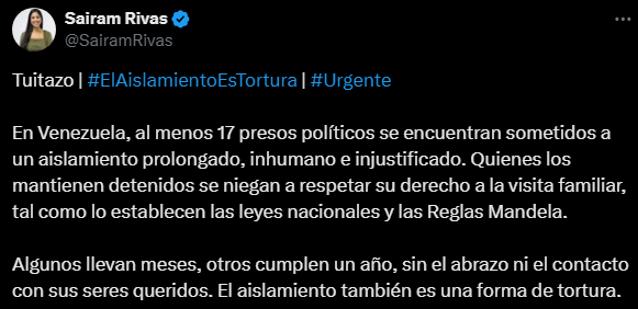 A través de su cuenta en X, Rivas denunció que «quienes los mantienen detenidos se niegan a respetar su derecho a la visita familiar, tal como lo establecen las leyes nacionales y las Reglas Mandela».