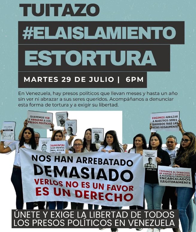 «Algunos llevan meses, otros cumplen un año, sin el abrazo ni el contacto con sus seres queridos. El aislamiento también es una forma de tortura», afirmó la activista, también pareja del exconcejal de Caracas Jesús Armas, detenido en diciembre pasado y quien, según Rivas, permanece «aislado» desde entonces.