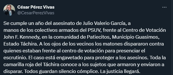 “Se cumple un año del asesinato de Julio Valerio García, a manos de los colectivos armados del PSUV. El caso está engavetado para proteger a los asesinos. Toda la camarilla roja del Táchira conoce a los sujetos que armaron y enviaron a disparar. Todos guardan silencio cómplice. La justicia llegará”, denunció el dirigente político a través de su cuenta en X.