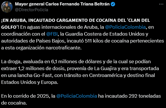 El director general de la Policía Nacional de Colombia, el mayor general Carlos Fernando Triana Beltrán, informó en redes sociales sobre la incautación de un cargamento de cocaína traficada por el Clan del Golfo en aguas de Aruba.