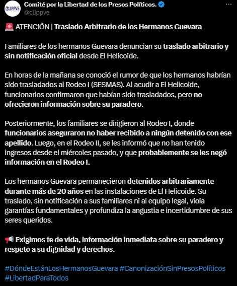 “En horas de la mañana se conoció el rumor de que los hermanos habrían sido trasladados al Rodeo I (SESMAS). Al acudir a El Helicoide, funcionarios confirmaron que habían sido trasladados, pero no ofrecieron información sobre su paradero”, informó el Comité. Los familiares visitaron Rodeo I, donde se les negó el ingreso de los Guevara, y en Rodeo II se les indicó que no había nuevos ingresos desde el miércoles pasado, sugiriendo que la información pudo ser ocultada en el primer centro penitenciario.