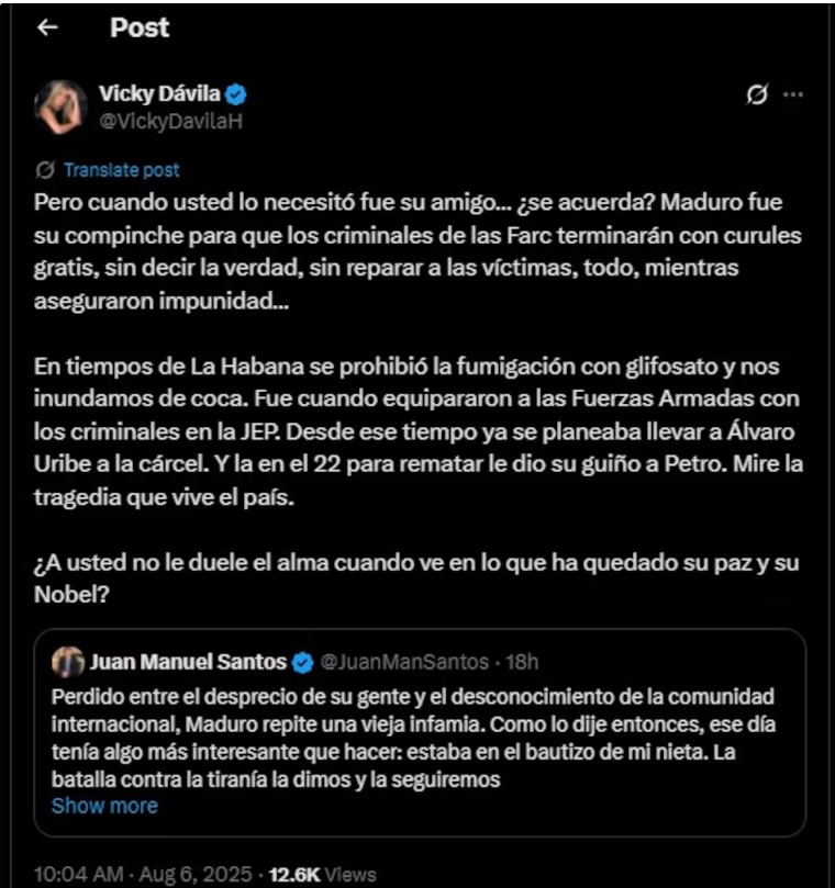 La periodista y candidata presidencial Victoria Eugenia Dávila Hoyos, reconocida como Vicky Dávila, respondió al mensaje publicado por Juan Manuel Santos dirigido a Nicolás Maduro.