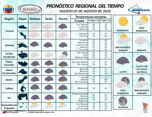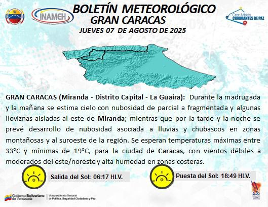 También se prevén lluvias dispersas hacia el este de Miranda y la región de Los Andes, especialmente en Táchira y Trujillo. Las condiciones podrían alternar entre áreas despejadas y momentos de fuertes precipitaciones.