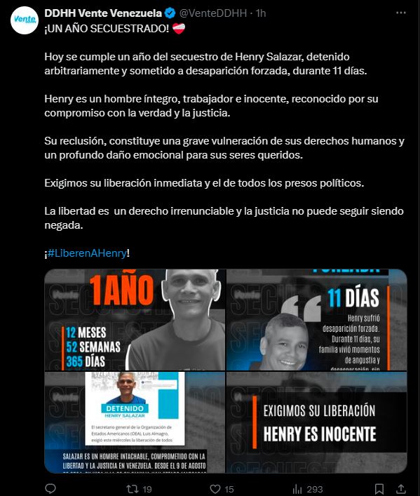 El mensaje fue acompañado por imágenes que resaltan los 12 meses de reclusión de Salazar, así como la exigencia de su excarcelación bajo el lema #LiberenAHenry.