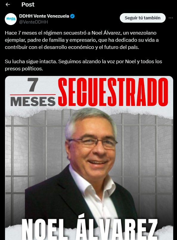 “Hace 7 meses el régimen secuestró a Noel Álvarez, un venezolano ejemplar, padre de familia y empresario, que ha dedicado su vida a contribuir con el desarrollo económico y el futuro del país. Su lucha sigue intacta. Seguimos alzando la voz por Noel y todos los presos políticos”, manifestó VV.