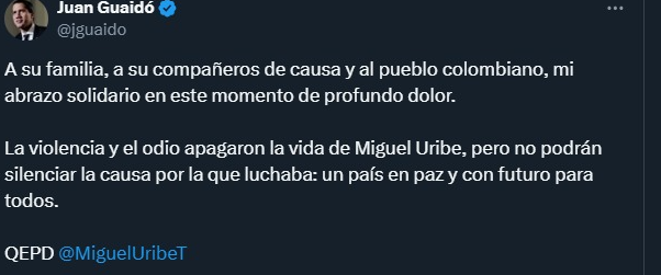 “A su familia, a sus compañeros de causa y al pueblo colombiano, mi abrazo solidario en este momento de profundo dolor. La violencia y el odio apagaron la vida de Miguel Uribe, pero no podrán silenciar la causa por la que luchaba: un país en paz y con futuro para todos”. publicó Guaidó a través de su cuenta personal en X.
