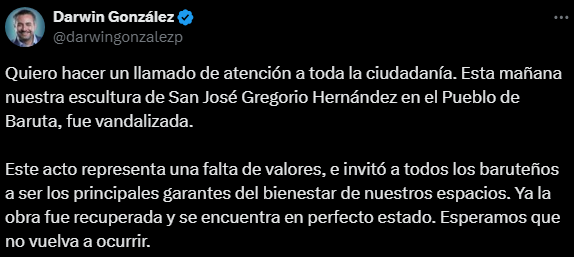 «Quiero hacer un llamado de atención a toda la ciudadanía. Esta mañana nuestra escultura de San José Gregorio Hernández en el Pueblo de Baruta, fue vandalizada. Este acto representa una falta de valores, e invitó a todos los baruteños a ser los principales garantes del bienestar de nuestros espacios», alertó González en un tuit.