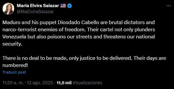 La congresista estadounidense María Elvira Salazar emitió este miércoles 13 de agosto un fuerte pronunciamiento contra Nicolás Maduro y Diosdado Cabello, a quienes calificó de “dictadores brutales y narcoterroristas enemigos de la libertad”.