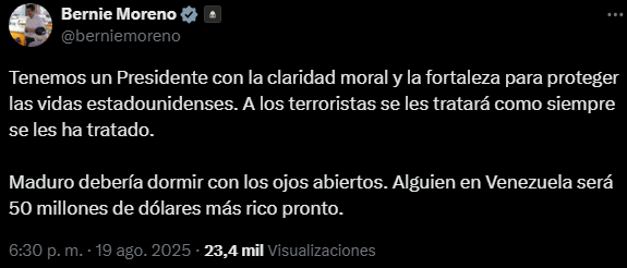 «Tenemos un presidente con la claridad moral y la fortaleza para proteger las vidas estadounidenses. A los terroristas se les tratará como siempre se les ha tratado», comentó Moreno en sus redes sociales, en referencia a las acciones ordenadas por Donald Trump contra el tráfico de drogas en el mar Caribe.