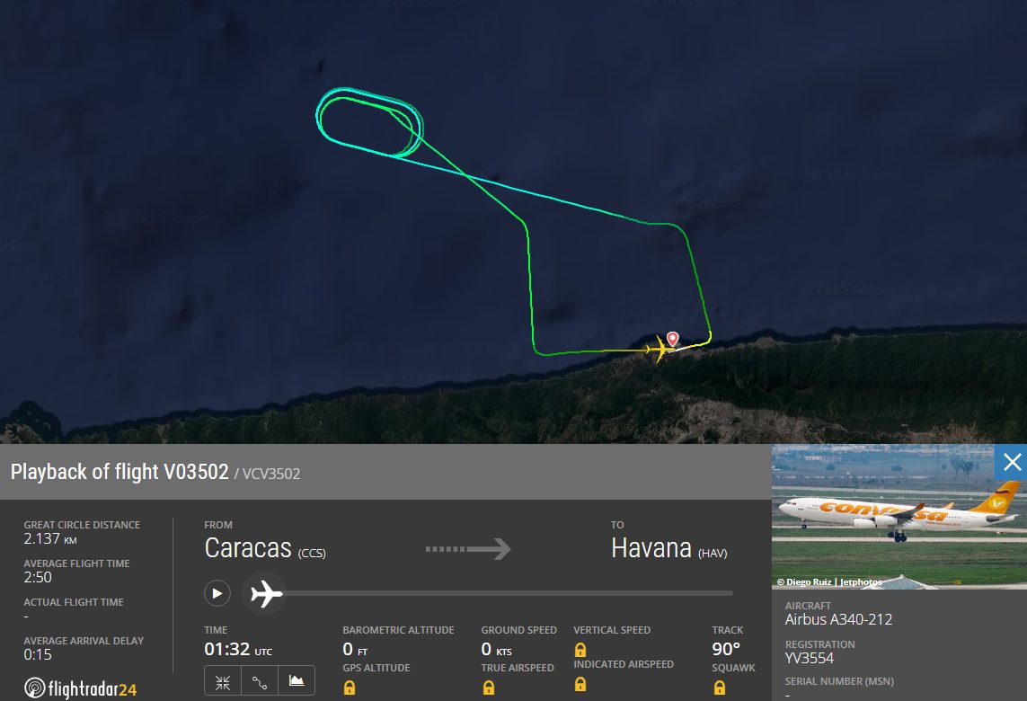 La aeronave de modelo Airbus A340, matrícula YV3554, recorrió 2.137 kilómetros y su viaje duró apenas 45 minutos, desde las 9:41 P.M. a las 10:26 P.M.