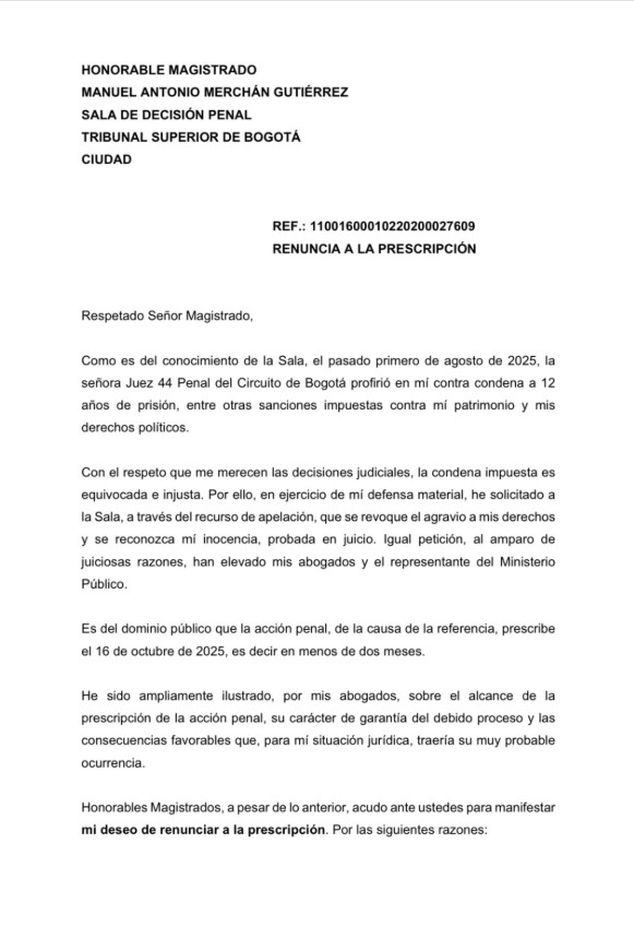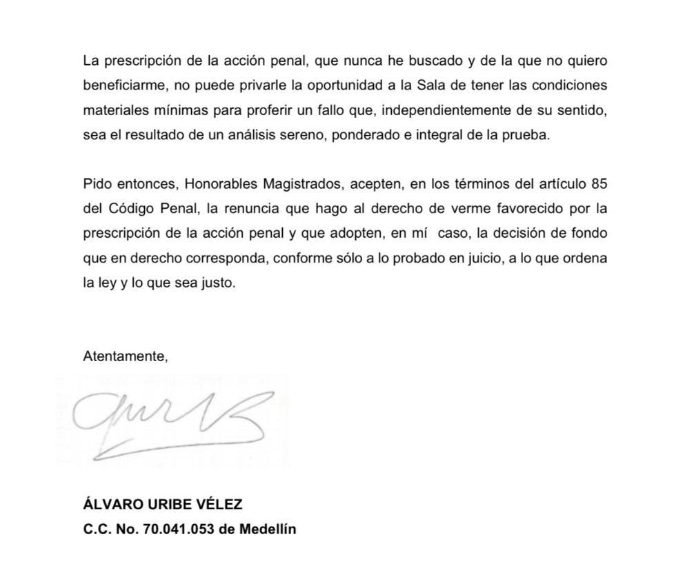 El expresidente colombiano Álvaro Uribe (2002-2010) renunció este lunes a la prescripción del caso en su contra por el que fue hallado culpable en primera instancia de los delitos de soborno en actuación penal y fraude procesal, y cuya fecha límite es el 16 de octubre próximo.