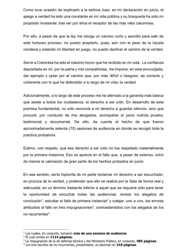 «A pesar de que la ley me otorga un camino corto y sencillo para salir de este tortuoso proceso, no puedo aceptarlo, pues, aún con el peso de la injusta condena y estando mí libertad en juego, no puedo declinar el camino de la verdad», dijo Uribe en una carta enviada al Tribunal Superior de Bogotá, que estudia la apelación de su condena.