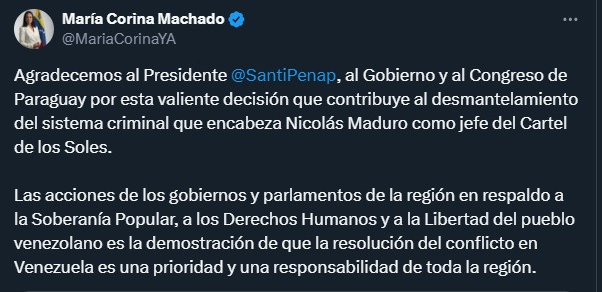 “Agradecemos al Presidente, al Gobierno y al Congreso de Paraguay por esta valiente decisión que contribuye al desmantelamiento del sistema criminal que encabeza Nicolás Maduro como jefe del Cartel de los Soles”, publicó la exdiputada a través de su cuenta personal en X.