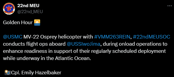 Asimismo, un helicóptero MV-22 Osprey también realizó recientemente operaciones de vuelo a bordo del USS Iwo Jima, «durante las operaciones de carga para mejorar la preparación en apoyo de su despliegue programado regularmente, mientras está en ruta en el océano Atlántico».