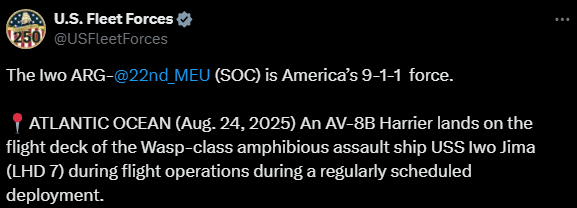 En publicaciones en redes sociales realizadas por la 22° Unidad Expedicionaria de Infantería de la Marina estadounidense, se observó a un caza AV-8B Harrier mientras aterrizaba en la cubierta de vuelo del buque anfibio, que partió hace pocos días de la Base Naval de Norfolk, en Virginia.