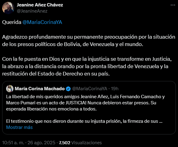 «Querida, María Corina, agradezco profundamente su permanente preocupación por la situación de los presos políticos de Bolivia, de Venezuela y el mundo», expresó Áñez en sus redes sociales.