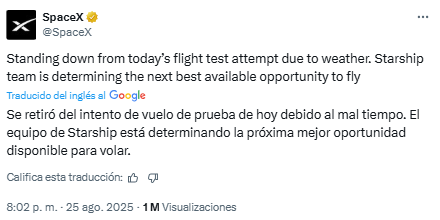 SpaceX pospuso el intento de vuelo de su nave espacial Starship, programado para el lunes 25 de agosto, debido a las condiciones meteorológicas.