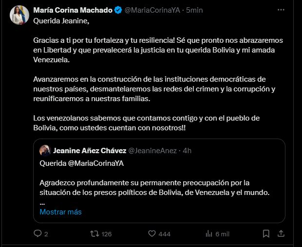 Anteriormente, Áñez le había dejado un mensaje a Machado: “Querida @MariaCorinaYA, agradezco profundamente su permanente preocupación por la situación de los presos políticos de Bolivia, de Venezuela y el mundo. Con la fe puesta en Dios y en que la injusticia se transforme en justicia, la abrazo a la distancia orando por la pronta libertad de Venezuela y la restitución del Estado de Derecho en su país”.