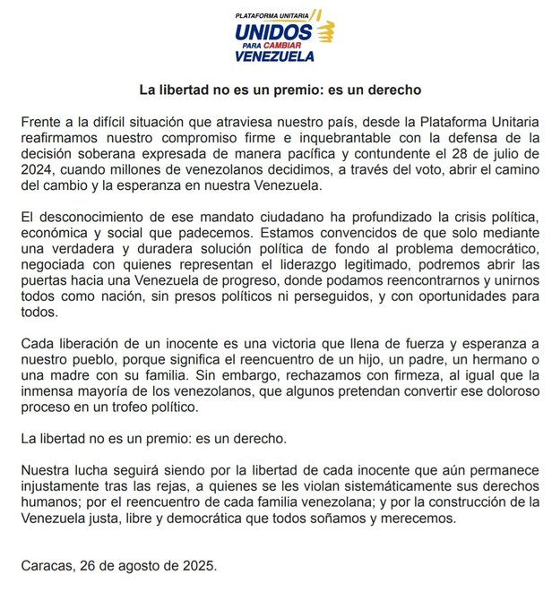 “Cada liberación a un inocente es una victoria que llena de fuerza y esperanza a nuestro pueblo (…) Sin embargo, rechazamos, al igual que la inmensa mayoría de los venezolanos, que algunos pretendan convertir este doloroso proceso en un trofeo político”, resaltó la alianza de partidos políticos de oposición en el escrito.