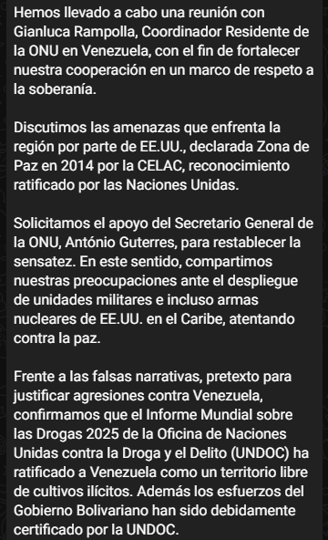 A través de un mensaje en su cuenta de Telegram, Gil informó que sostuvo una reunión con Gianluca Rampolla, coordinador residente de la ONU en Venezuela, “con el fin de fortalecer la cooperación en un marco de respeto a la soberanía”.
