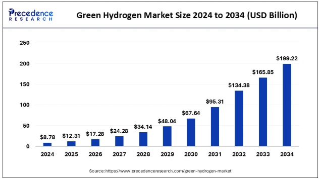 El tamaño del mercado mundial de hidrógeno verde representó USD 8,78 mil millones en 2024 y se prevé que aumente de USD 12,31 mil millones en 2025 a aproximadamente USD 199,22 mil millones para 2034, expandiéndose a una CAGR del 41,46% entre 2025 y 2034.