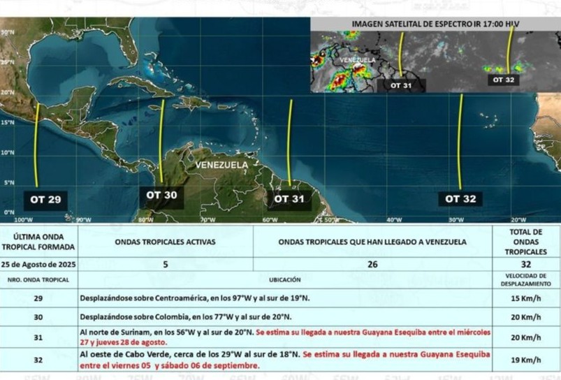 En su cuenta de Telegram, explicó que también se aproxima la vaguada 32, la cual se encuentra al oeste de Cabo Verde. Estaría ingresando por el Esequibo el viernes 05 y sábado 6 de septiembre.