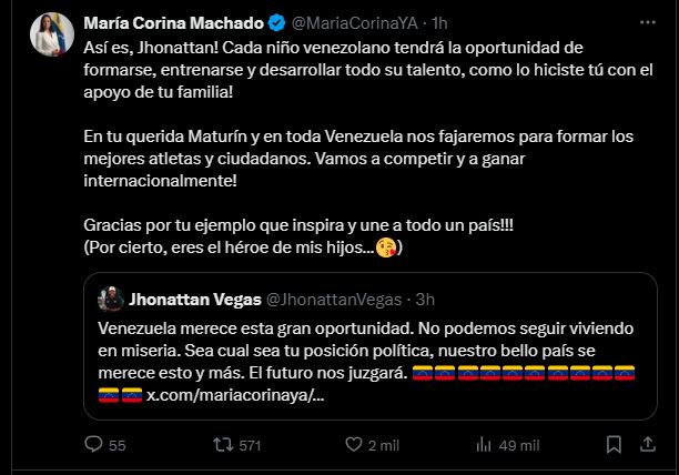 «¡Asfes, Jhonattan! Cada niño venezolano tendrá la oportunidad de formarse, entrenarse y desarrollar todo su talento como lo hiciste tú con el apoyo de tu familia. En tu querida Maracaibo y en toda Venezuela nos fajaremos para formar los mejores atletas y ciudadanos. Vamos a competir y ganar internacionalmente. Gracias por tu ejemplo que inspira y une a todo un país!! (Por cierto, eres el héroe de mis hijos)», manifestó Machado.