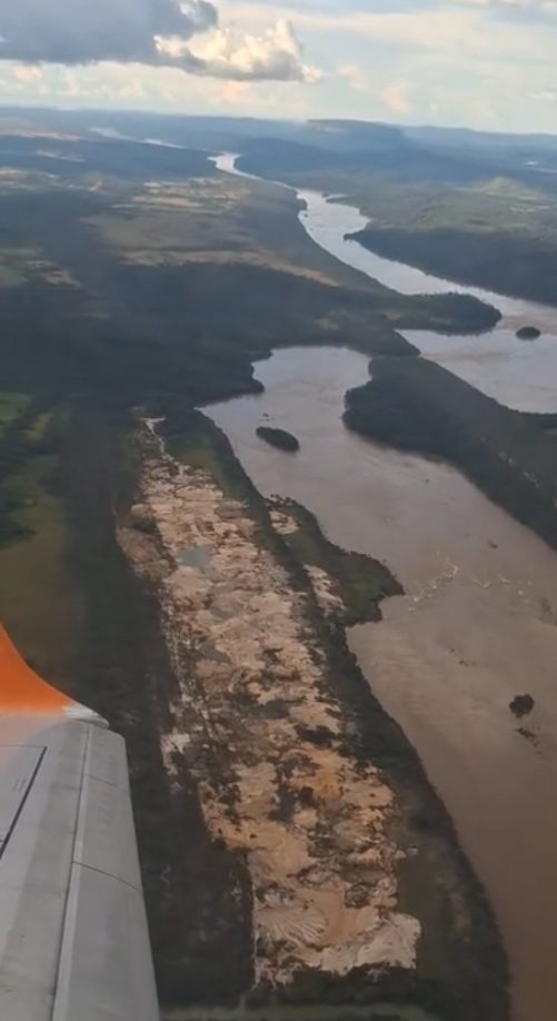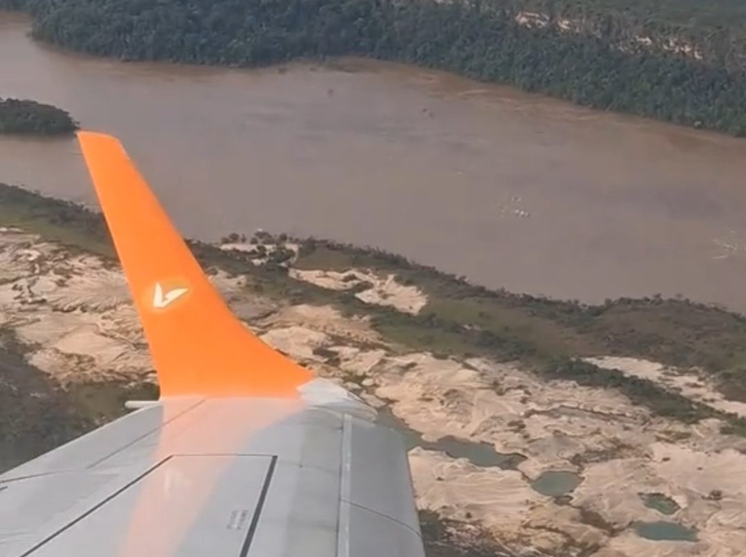 Pasajeros registraron recientemente, desde un avión de la aerolínea estatal Conviasa, el ecocidio producido por la minería ilegal a cielo abierto en la ribera del río Caroní, a la altura del Parque Nacional Canaima, estado Bolívar.