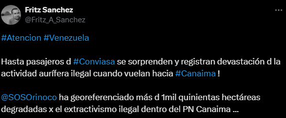 «¡Hasta pasajeros de Conviasa se sorprenden y registran devastación de la actividad aurífera ilegal cuando vuelan hacia Canaima!», lamentó Sánchez en una publicación en X.