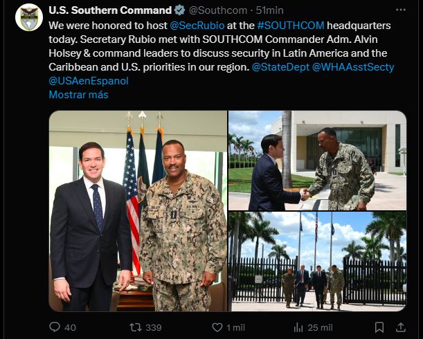 El Comando Sur de Estados Unidos informó este viernes 29 de agosto, que recibió en su sede al Secretario de Estado, Marco Rubio, quien sostuvo una reunión con el Comandante del Comando Sur, Almirante Alvin Holsey, y altos líderes militares para abordar temas de seguridad en América Latina y el Caribe.