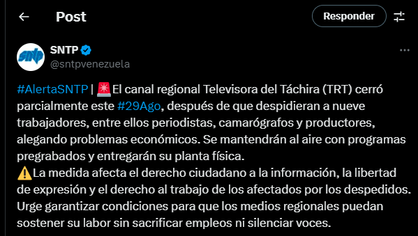 El Sindicato Nacional de Trabajadores de la Prensa (Sntp) denunció este viernes 29 de agosto, el cierre parcial de la Televisora Regional del Táchira (TRT), luego de que la planta despidiera a nueve trabajadores, entre ellos periodistas, camarógrafos y productores, alegando problemas económicos.