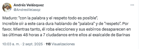 La denuncia de Velásquez se da en respuesta a unas declaraciones del régimen, que Velásquez considera cínicas. «Increíble oír a este cara dura hablando de ‘palabra’ y de ‘respeto’. Por favor», escribió Velásquez, citando un comentario de Nicolás Maduro: «con la palabra y el respeto todo es posible».
