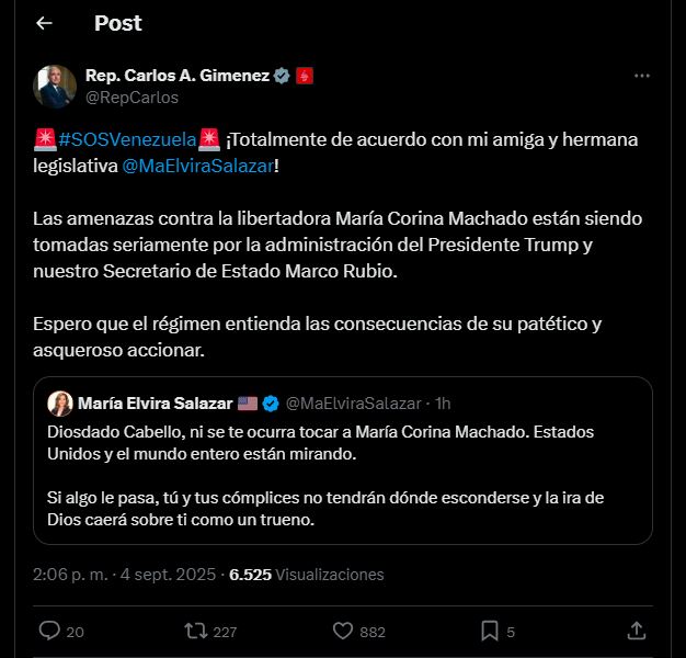 El congresista republicano por Florida, Carlos A. Gimenez, se pronunció la tarde de este jueves 4 de septiembre en su cuenta oficial de X (antes Twitter), condenando las recientes amenazas de Diosdado Cabello contra la líder opositora María Corina Machado, en medio de la tensión que vive Venezuela por el operativo militar de Estados Unidos en el mar Caribe.